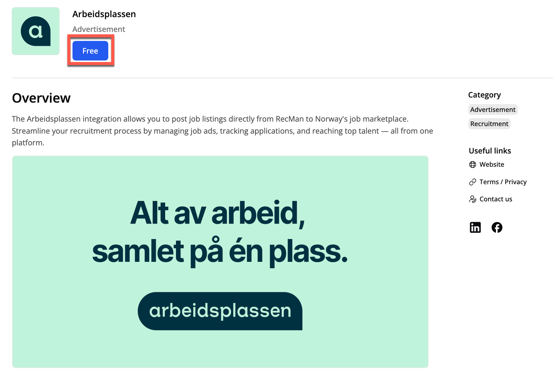 Arbeidsplassen integrasjonen lar deg publisere stillingsannonser direkte fra RecMan til Norges jobbmarked nav.no. Den gjør det mulig å effektivisere rekrutteringsprosessen ved å administrere stillingsannonser, spore søknader og koble til topptalenter — alt fra én plattform.