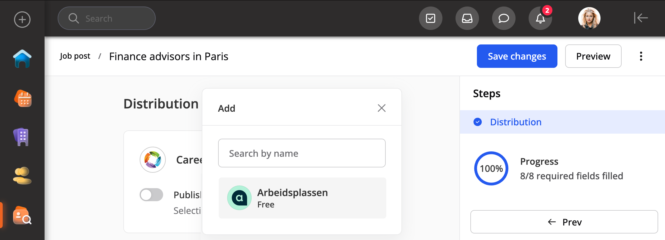 Når du oppretter en stillingsannonse, vil du ha muligheten til å legge til Arbeidsplassen på Distribusjonssteget, og stillingsannonsen vil bli publisert på denne plattformen.