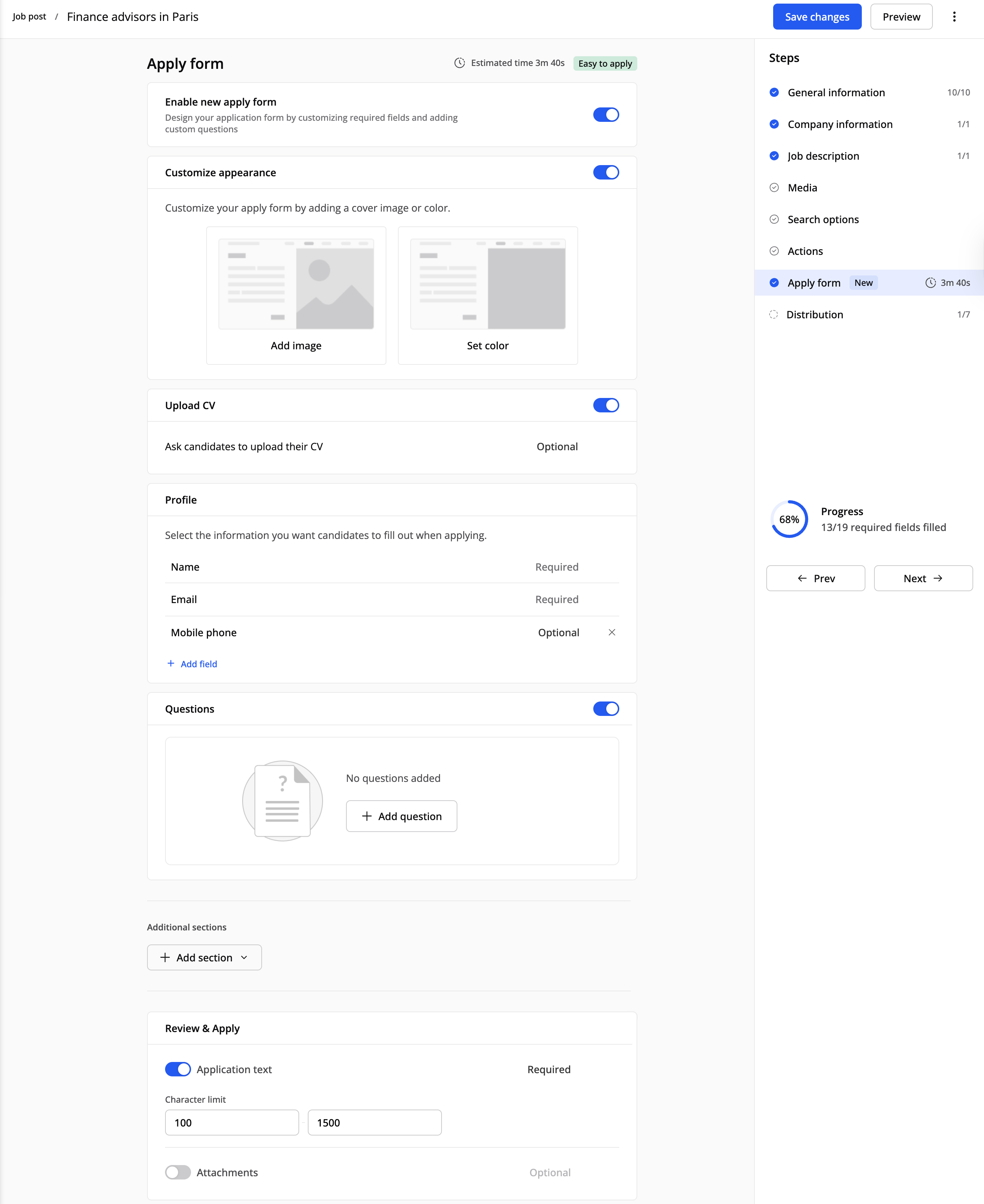 I redigerings verktøyet for stillingsannonsen, finn Søknadsskjema steget i høyre sidestolpe (merket med Ny). Slå det på for å aktivere det nye skjemaet. Estimert tid for å søke viser hvor lang tid skjemaet tar og oppdateres i sanntid når du legger til steg. Vanskelighets indikatoren viser lett, middels eller vanskelig og oppdateres direkte basert på skjemaets kompleksitet.