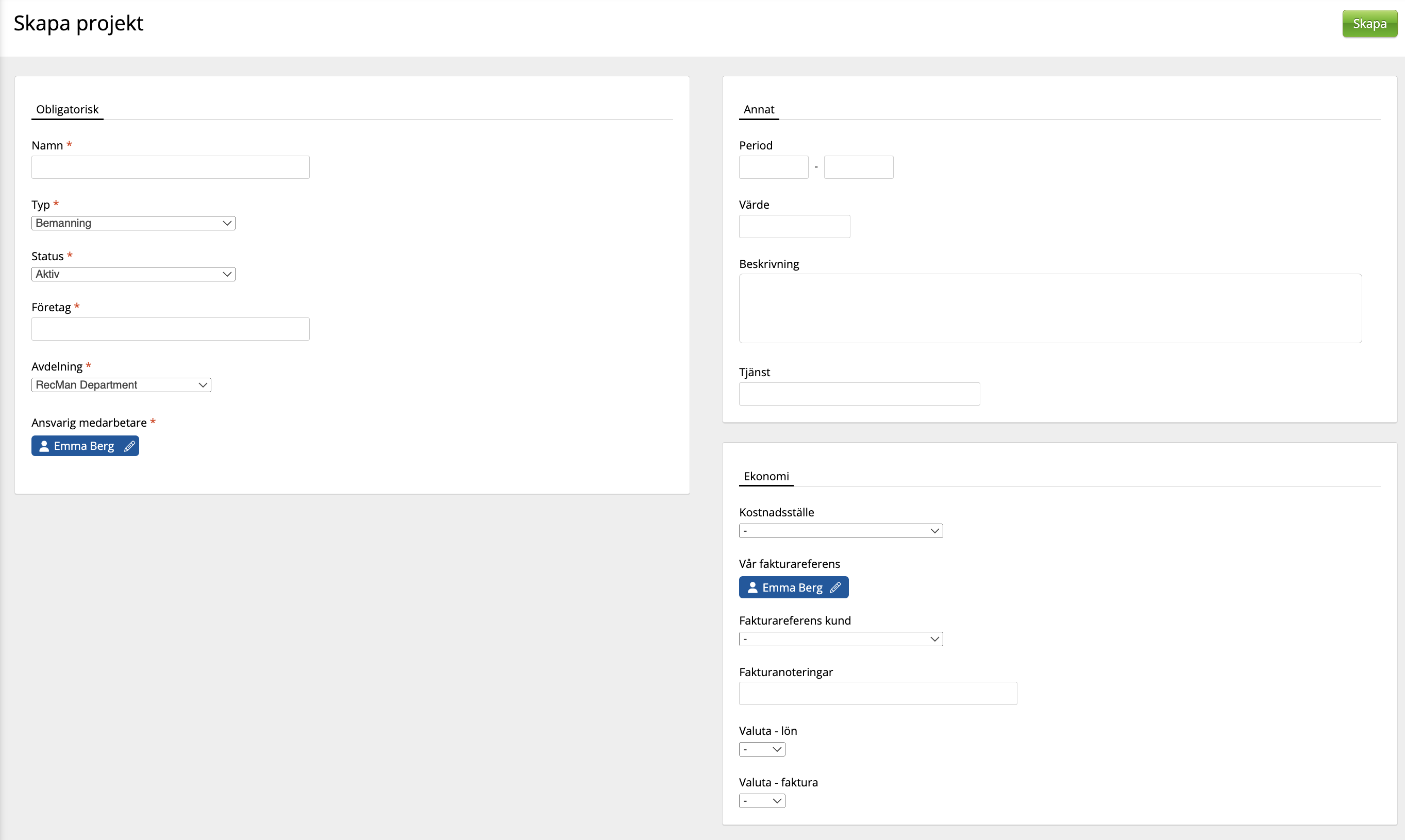 RecMan är uppbyggt kring projekt. Oavsett om du skapar en förfrågan, en ny personaltillsättning, ett rekryteringsuppdrag eller en jobbannons så behövs ett projekt i botten. Detta för att hålla ordning på allt i systemet.