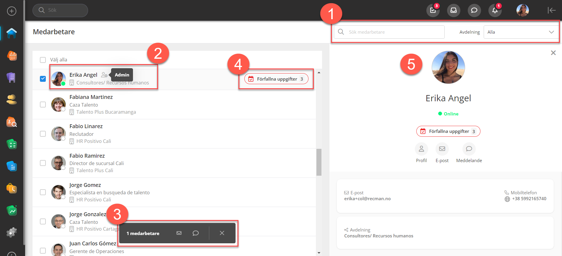 Genom att klicka på en medarbetare öppnas en låda (på höger sida) med mer information och funktioner för att se profilen, skicka e-post och interna meddelanden. Du kan också välja flera kollegor, vilket möjliggör funktioner för att skicka e-post eller meddelanden till de valda kollegorna. En grön prick bredvid deras profilbild indikerar deras onlinestatus, och till höger kommer alla förfallna uppgifter att visas för varje medarbetare.