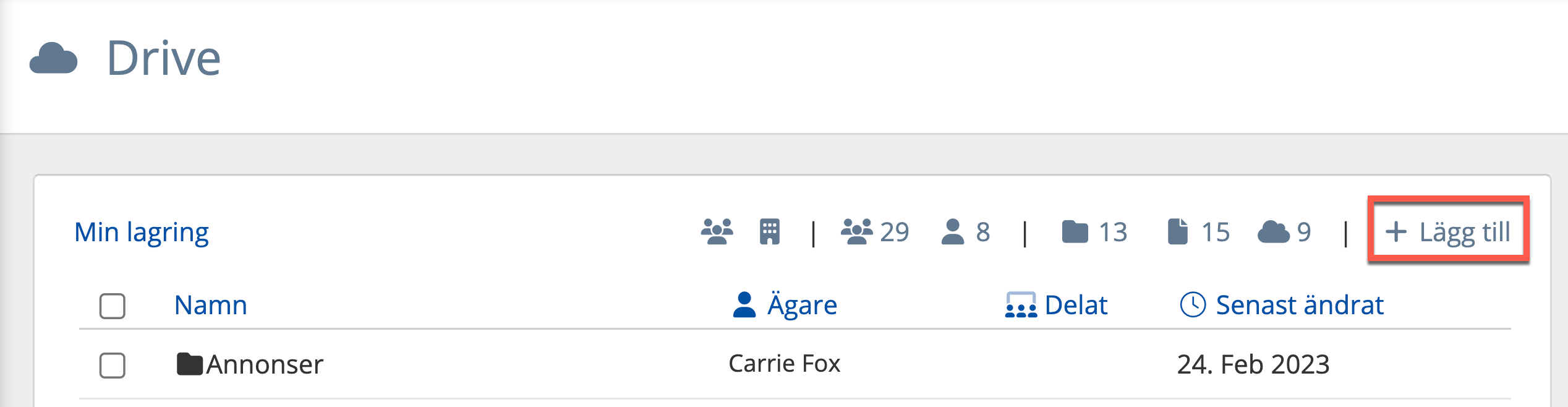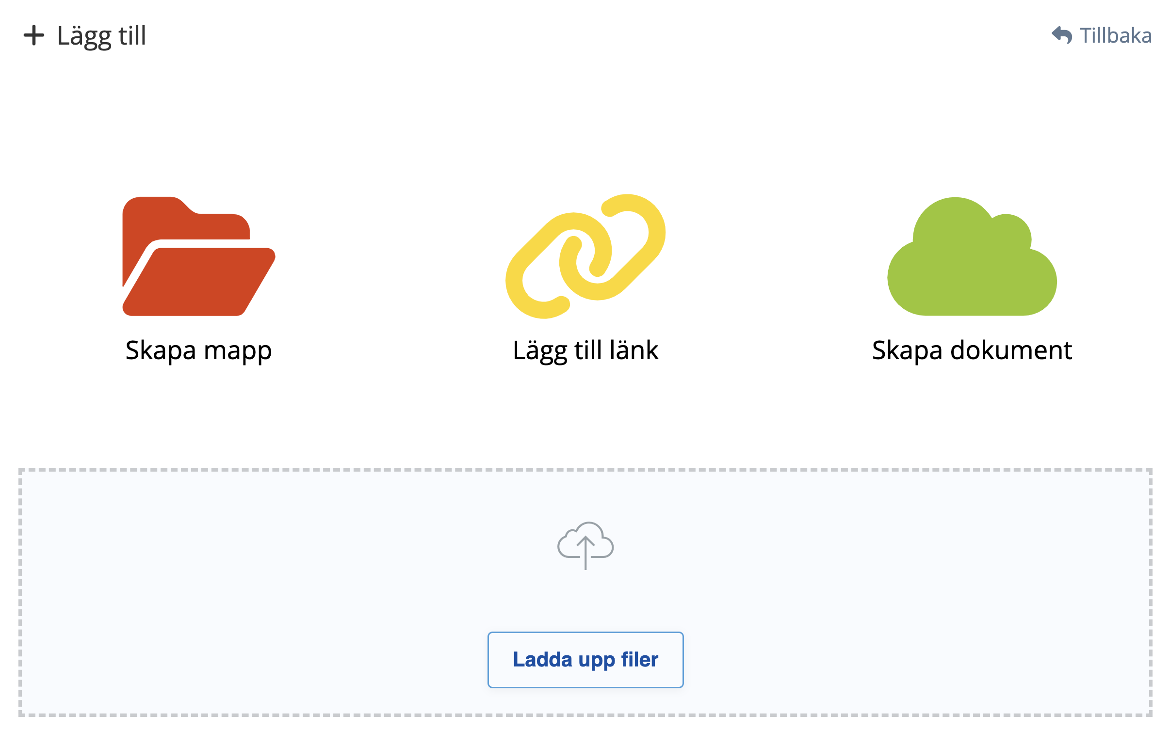 När du befinner dig i Hem-modulen, klicka på Filarkiv-knappen som finns till höger i Blå knapp-menyn. För att lägga till ett element, så klicka +Lägg till i det övre högra hörnet. Nu får du alternativen att lägga till en folder, en länk, ett dokument eller att ladda upp en fil. Utgångsläget är att alla element som du lägger till är synliga endast för dig. Du behöver aktivt dela dem för att ge kollegor tillgång.