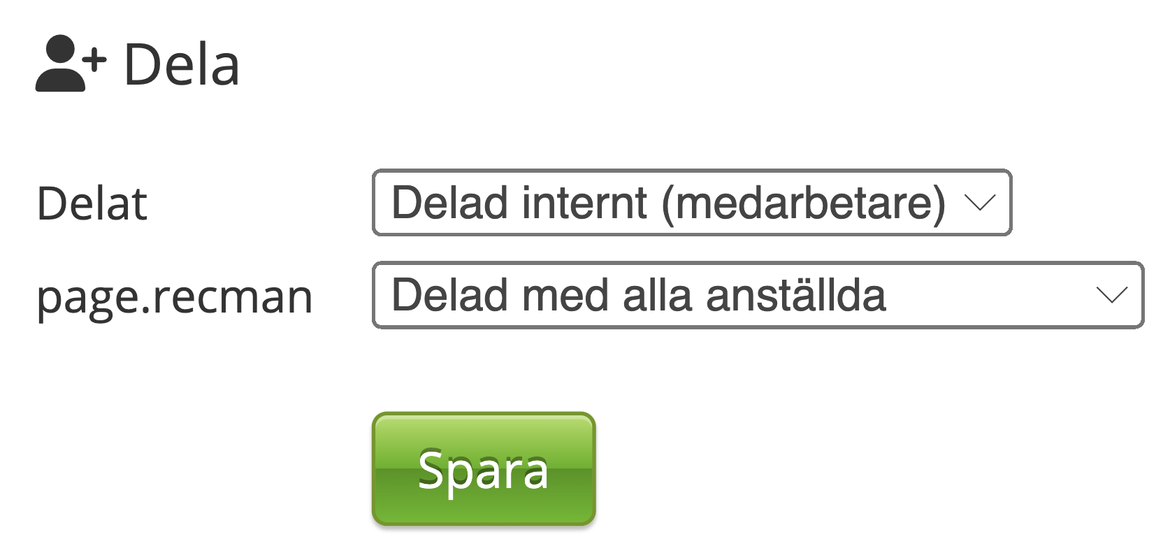 Tänk på att delningsinställningarna som syns när du klickar på delningsknappen inte anger de rättigheter som du satt. Det kommer vara förinställt med Delad som Delad internt och RecMan-sida som Ej delad. För att kontrollera den faktiska delningsstatusen, se kolumnen för Delning i filarkivet.