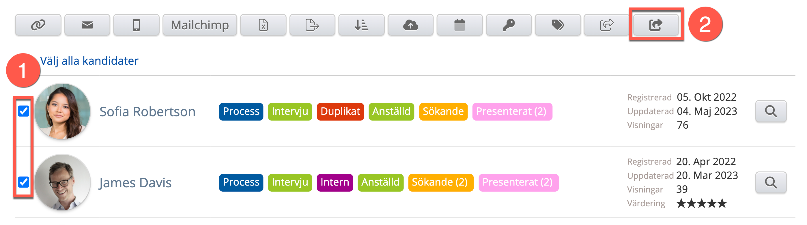Välj en eller flera kandidater från listan. Till din hjälp kan du använda filter för att hitta kandidaterna som du vill dela filen med. När en kandidat valts dyker det upp en knapprad ovanför bilden. Du klickar på knappen längst till höger.