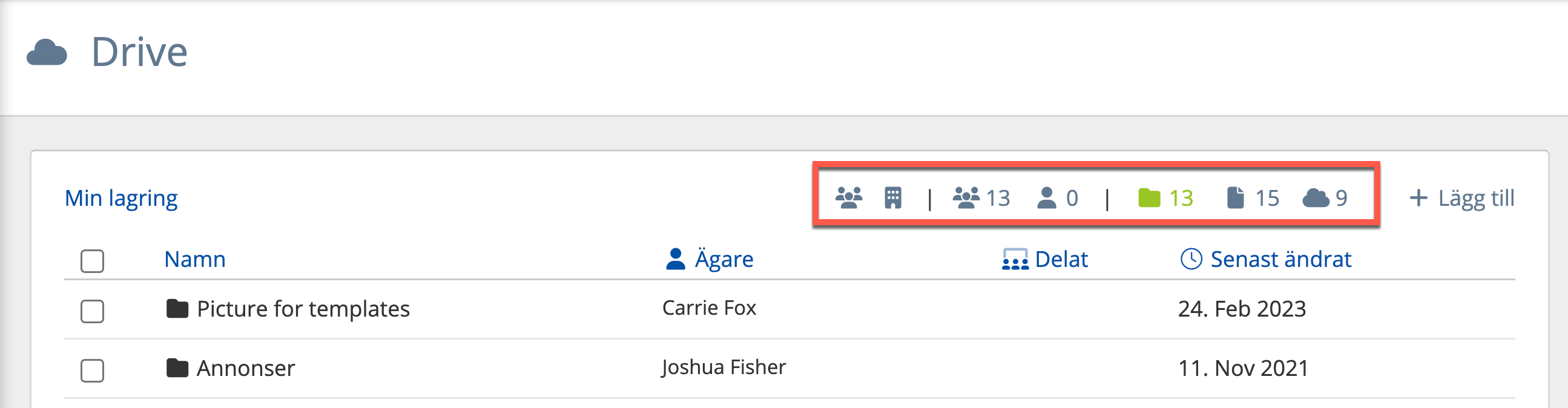- Mina – Låter dig se endast filer som du laddat upp och är ägare till