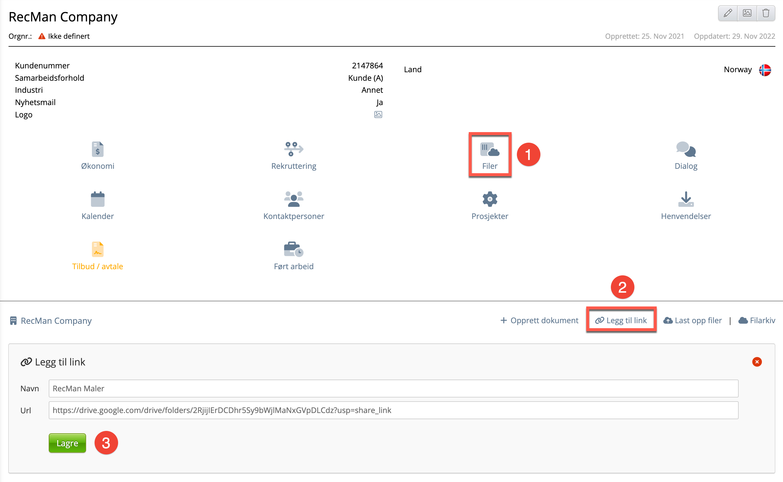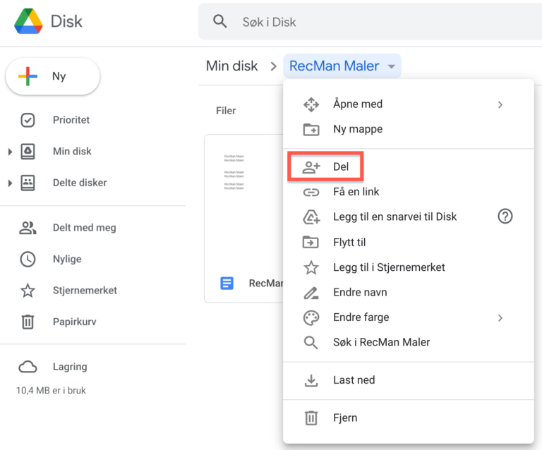 Denne filmen viser hvordan man deler dokumenter og mapper i Google Drive, følger du denne kan du hoppe ned til Legge til link i RecMan.