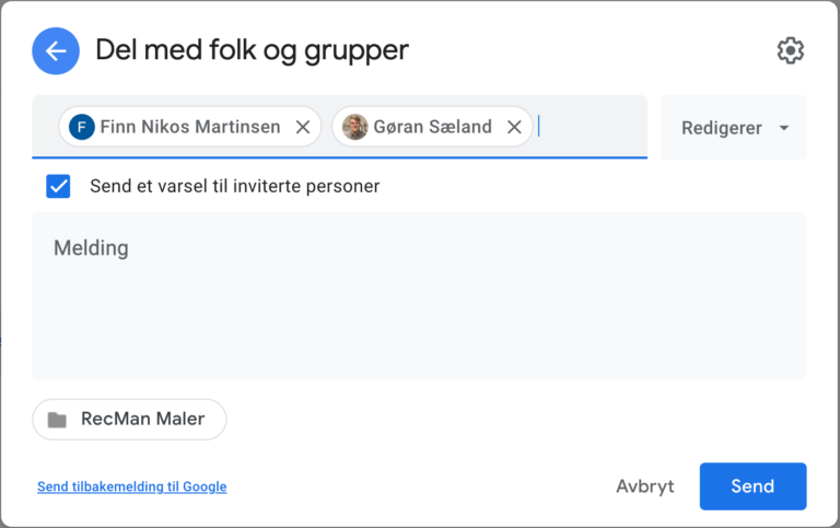 Etter man har trykt på del-knappen vil det komme opp et boks der man kan definere hvem som skal ha rettighet til å se innholdet i dokumentet, eller om de også skal kunne redigere det. Dette gjøres ved å legge til e-postadressene til vedkommede.