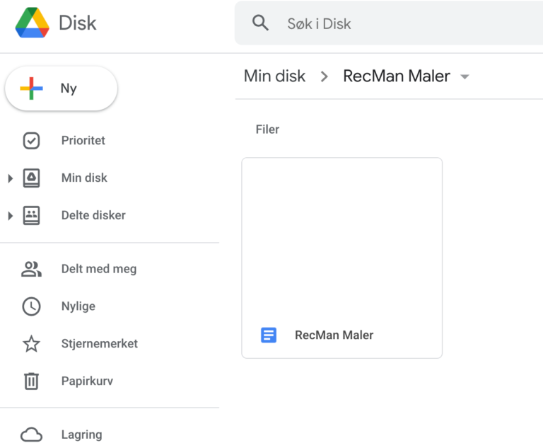 Når du står inne i oversikten i Google Drive, ser man alle filer, mapper og dokumenter man har lagret der (i tilfellet nedenfor er det en mappe med navn RecMan Maler og et dokument med navn RecMan Maler).