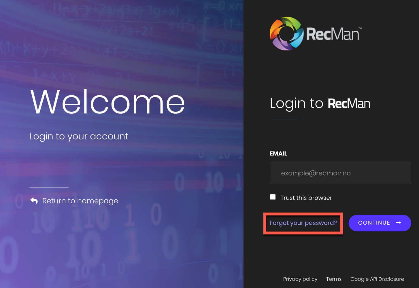 1. Gå till recman.io login och klicka på "Glömt ditt lösenord?".