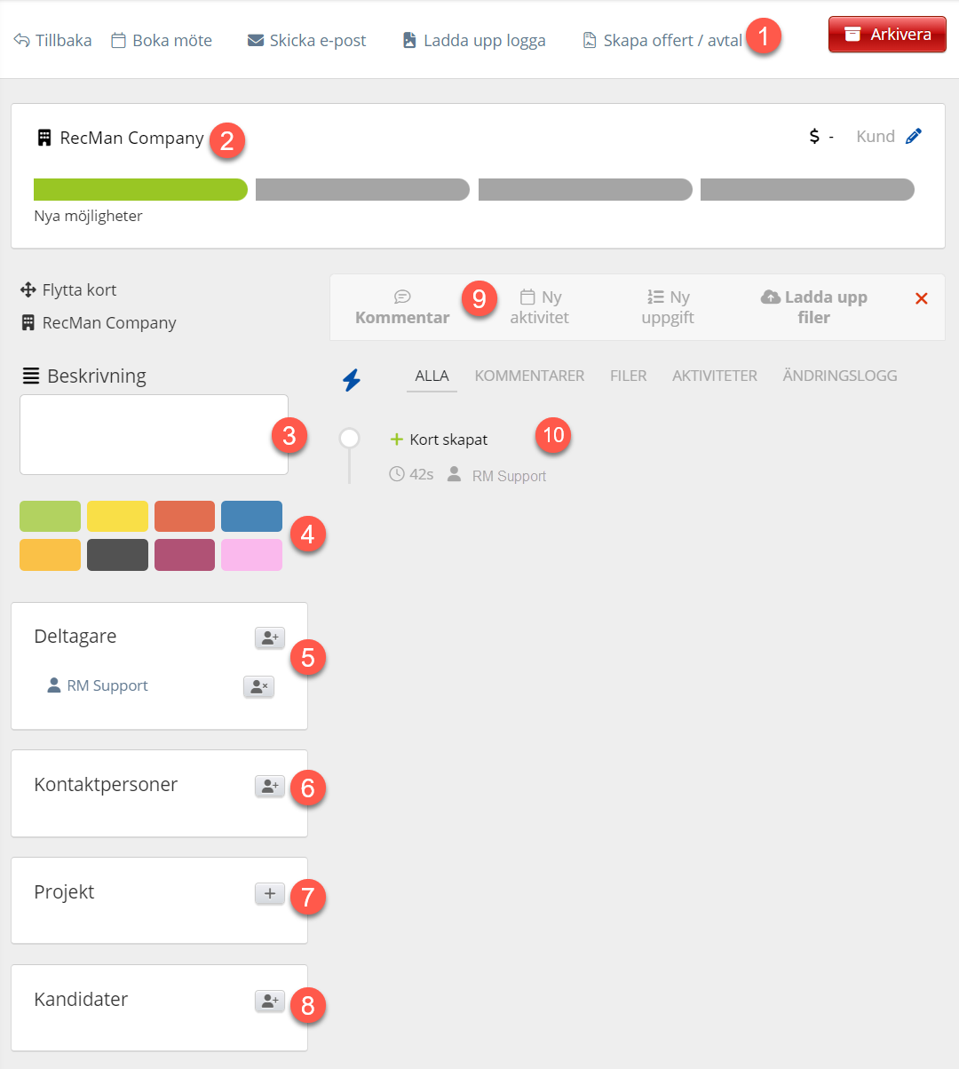 - Från den här delen av kortet kan vi enkelt göra flera saker. Alla funktioner kan kopplas till kontaktpersoner i företaget. Dessa funktioner fungerar i samarbete med aktivitetsloggen (punkt 10) för att ge en exakt tidslinje på kortet. Vi kommer snart att gå igenom dem här:
