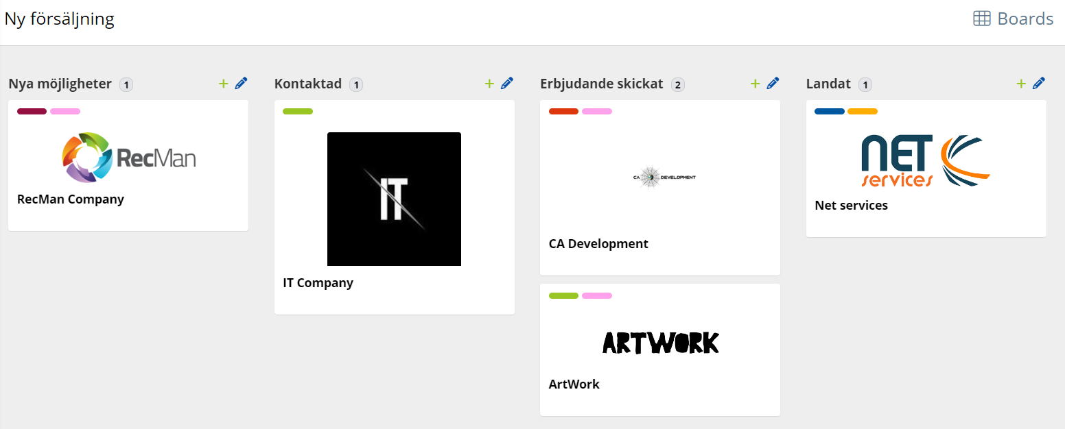 Efter en viss användning får vi en bra översikt över de olika kunderna i vår process. Du kan med en blick få information om varje företag och du kan klicka på varje kort för att se de senaste aktiviteterna och händelserna för att ta reda på vad nästa steg är. Observera att korten själva kan dras och släppas för att enkelt flytta dem till olika listor.