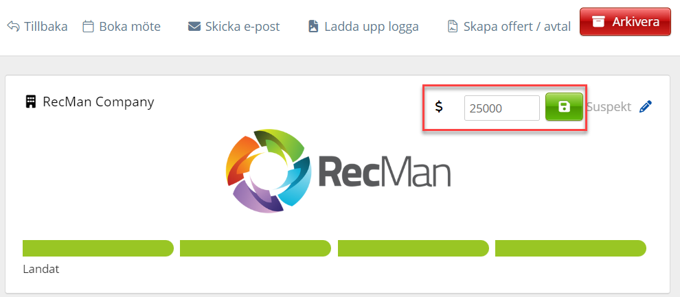 Du kan också ställa in ett värde för varje kort i pipelinen. Klicka bara på dollarikonen och ange värdet. Vad värdet innebär är något vi rekommenderar att du och dina medarbetare kommer överens om internt.