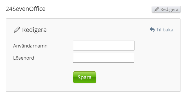 Från Systeminställningar → Ekonomi → Avdelningar → 24SevenOffice kan du klicka på Redigera och ange användarnamn och lösenord för 24SevenOffice-användaren.