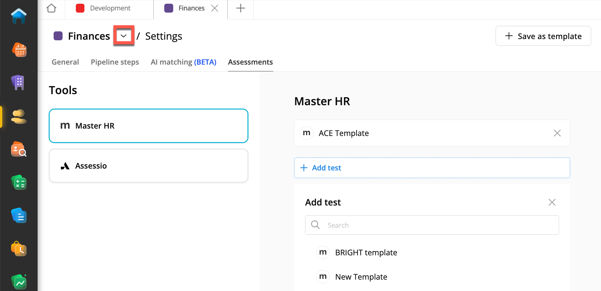 I samma rekryteringsprojektinställningar, välj Processteg. Välj sedan önskat Master HR-test för det valda steget. I exemplet nedan lägger vi till testet "ACE template" till Bedömningssteget i Finanser-projektets inställningar.