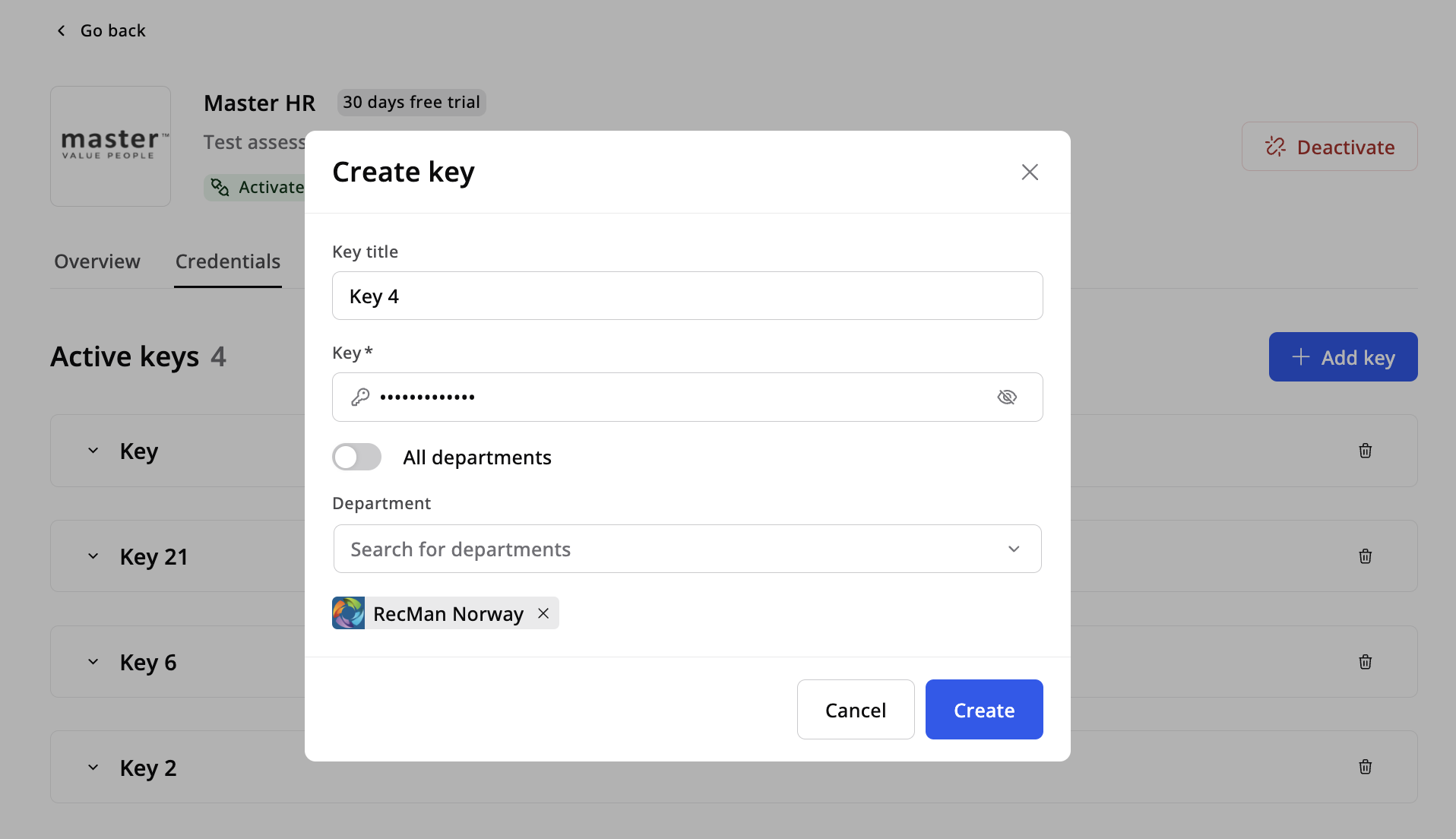 Lägg till dina uppgifter: Ange din Master HR API-nyckel som du fått från Master HR-supporten. Namnge nyckeln och välj om API-nyckeln ska vara tillgänglig för: