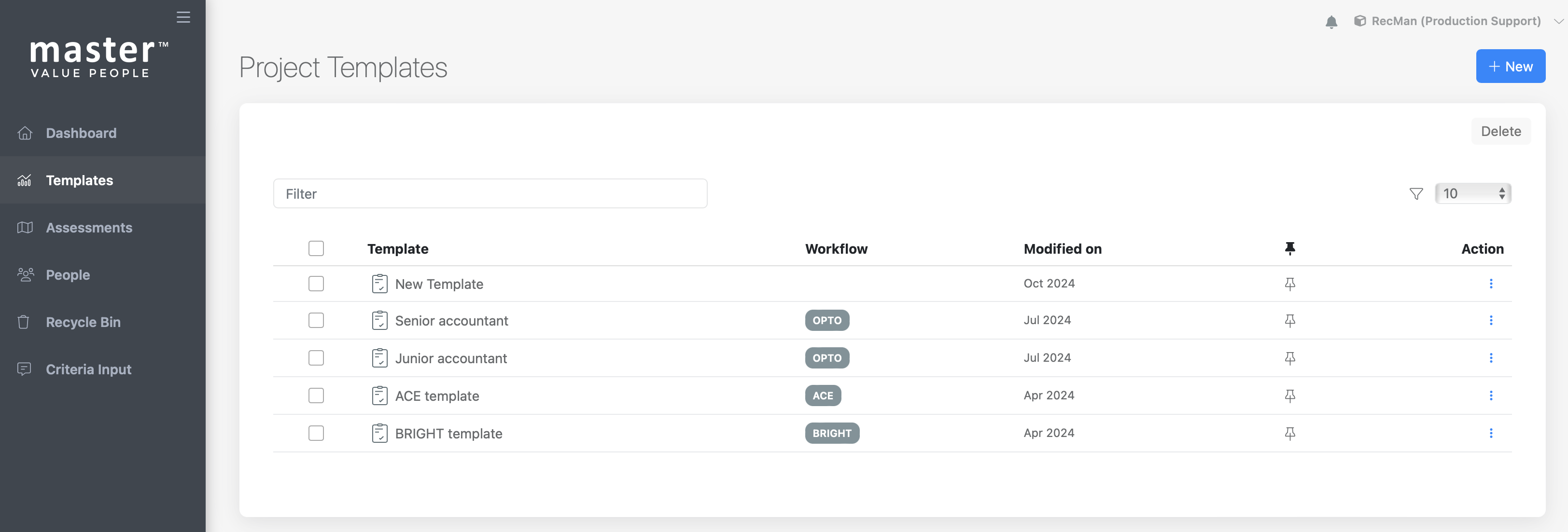 Tidigare lades bedömningar till i Master HR-kontot och användes i RecMan-projekt. Nu kommer vi att använda mallarna i Master HR för att skapa nya bedömningar för ditt rekryteringsprojekt i RecMan. Gå in på ditt Master HR-konto för att skapa nya mallar som inkluderar alla bedömningar och kriterier du behöver.