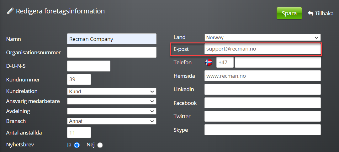 Kontrollera att rätt mailadress finns inne hos kunden i CRM under företagsinformation.