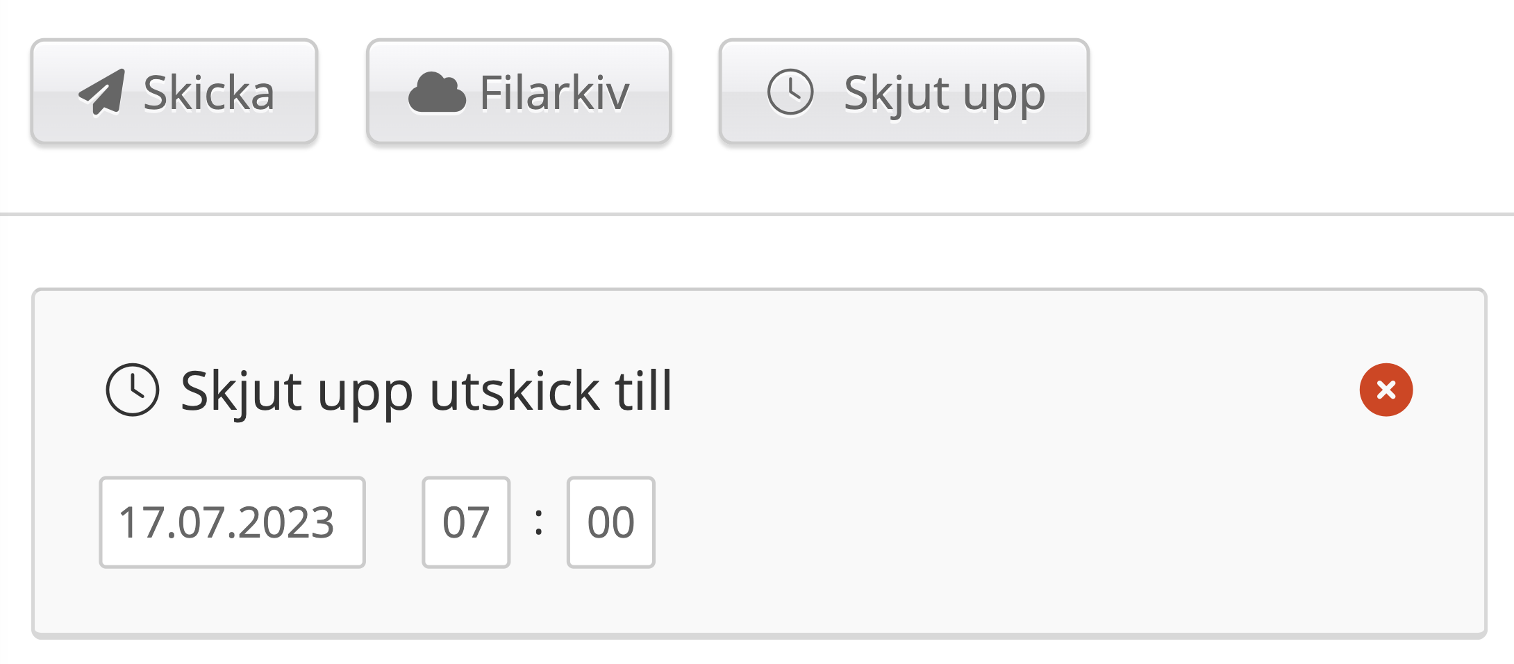 På den första bilden kan du se knappen Skjut upp till höger om menyn. Detta kommer att öppna en ruta, som kan ses i den andra bilden, där du kan ställa in ett datum och en tid för när du vill att e-postmeddelandet ska skickas.