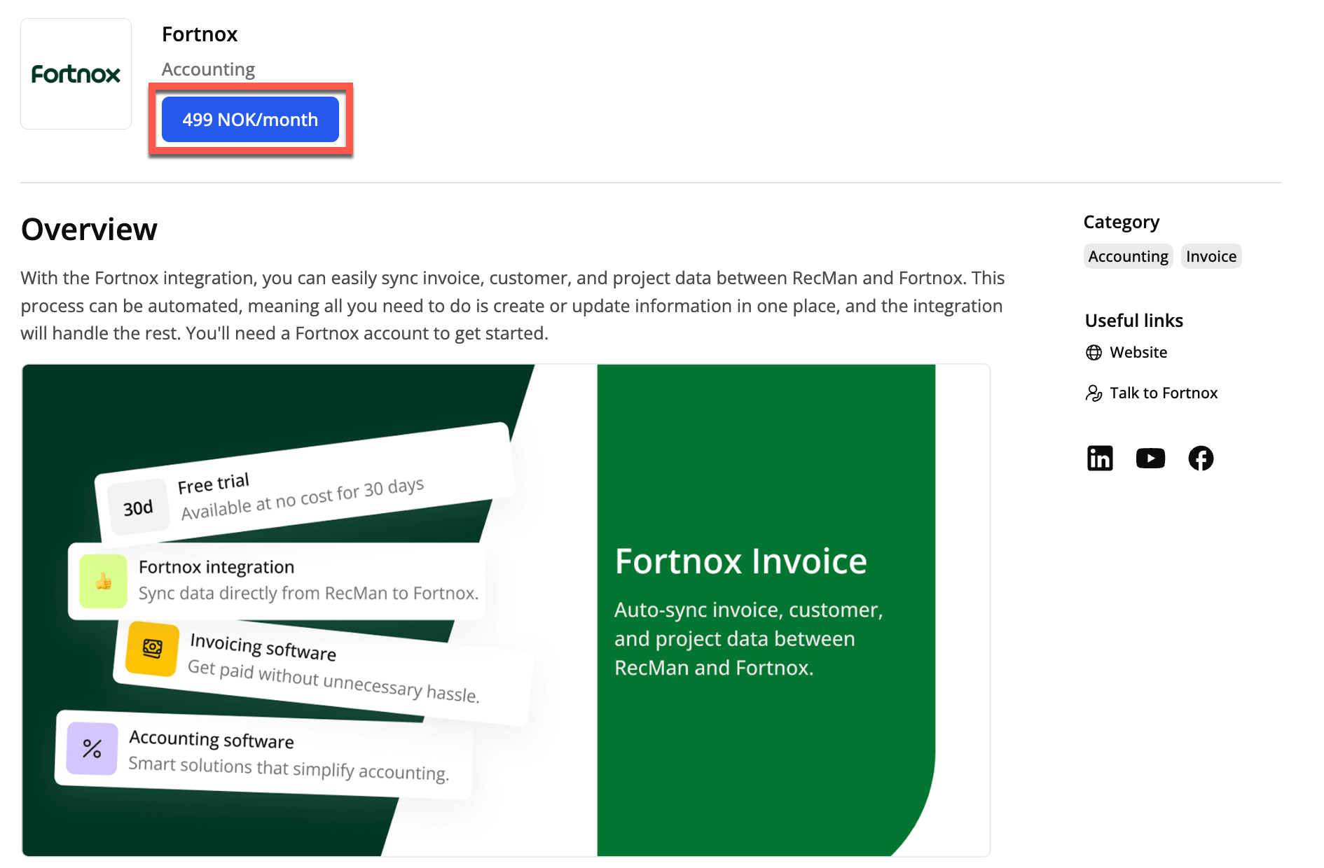 Klicka på den blå aktiveringsknappen med priset för att börja använda Fortnox-integrationen.