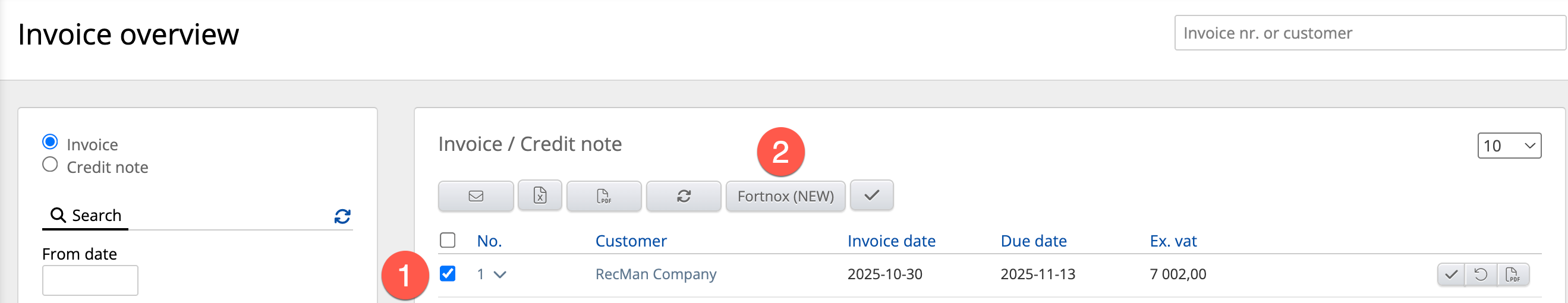Fakturaexport till Fortnox är nu aktiverat och kan användas. Se bilden nedan för hur det ser ut i fakturaöversikten.
