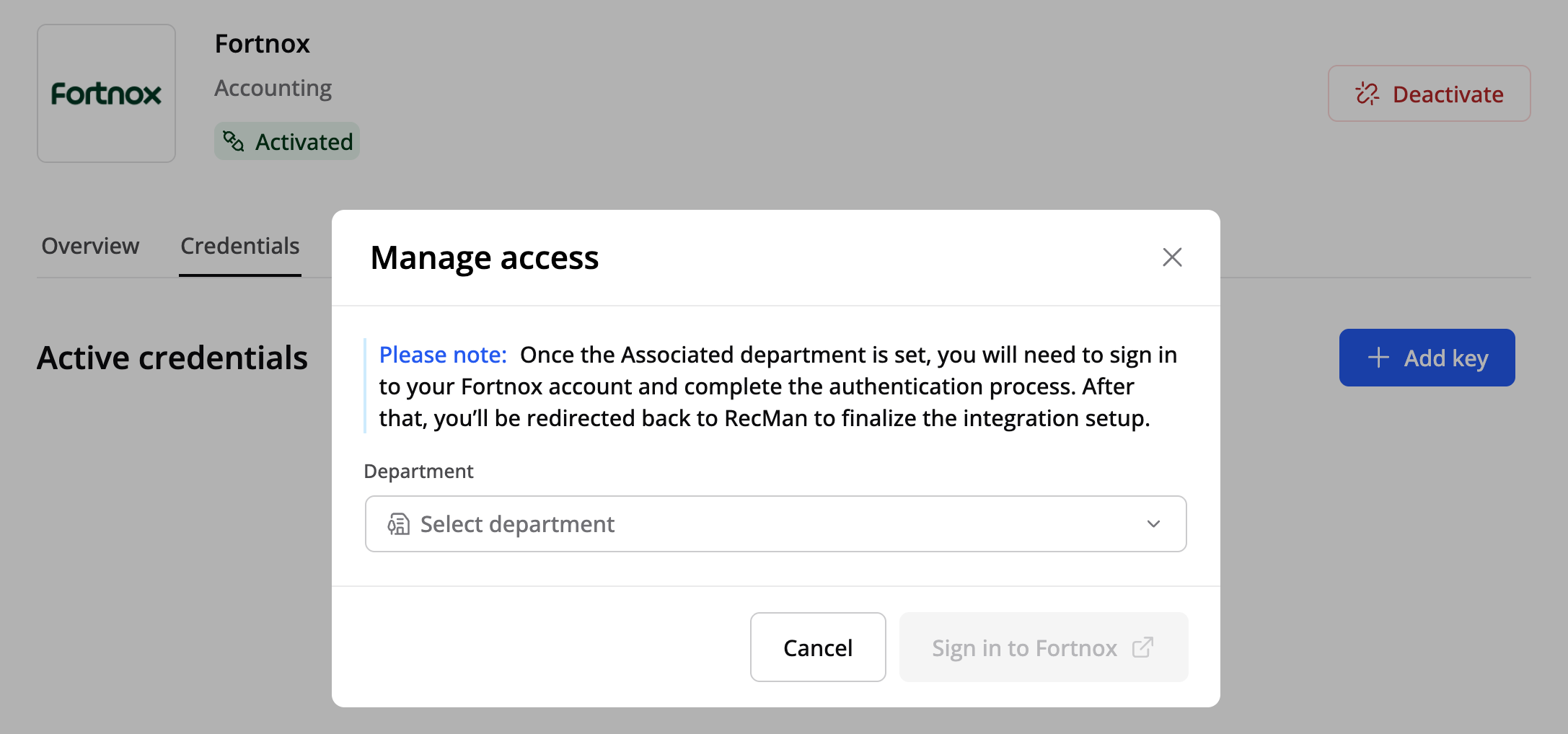 Du kommer att omdirigeras till Fortnox webbplats för att logga in, välja din organisation, granska och acceptera alla nödvändiga behörigheter. När du återvänder till "Hantera åtkomst"-modalen, ange Nyckelnamn som sista steg.
