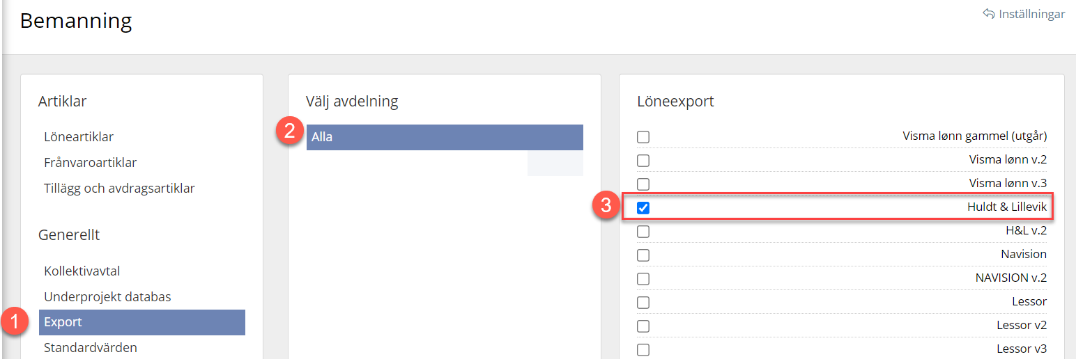 Gå till Systeminställningar → Bemanning → Export → Välj avdelning = Alla → kryssa för Huldt & Lillevik (H&L). Då kommer H&L att dyka upp som ett alternativ vid export av en lönecheck i RecMan.
