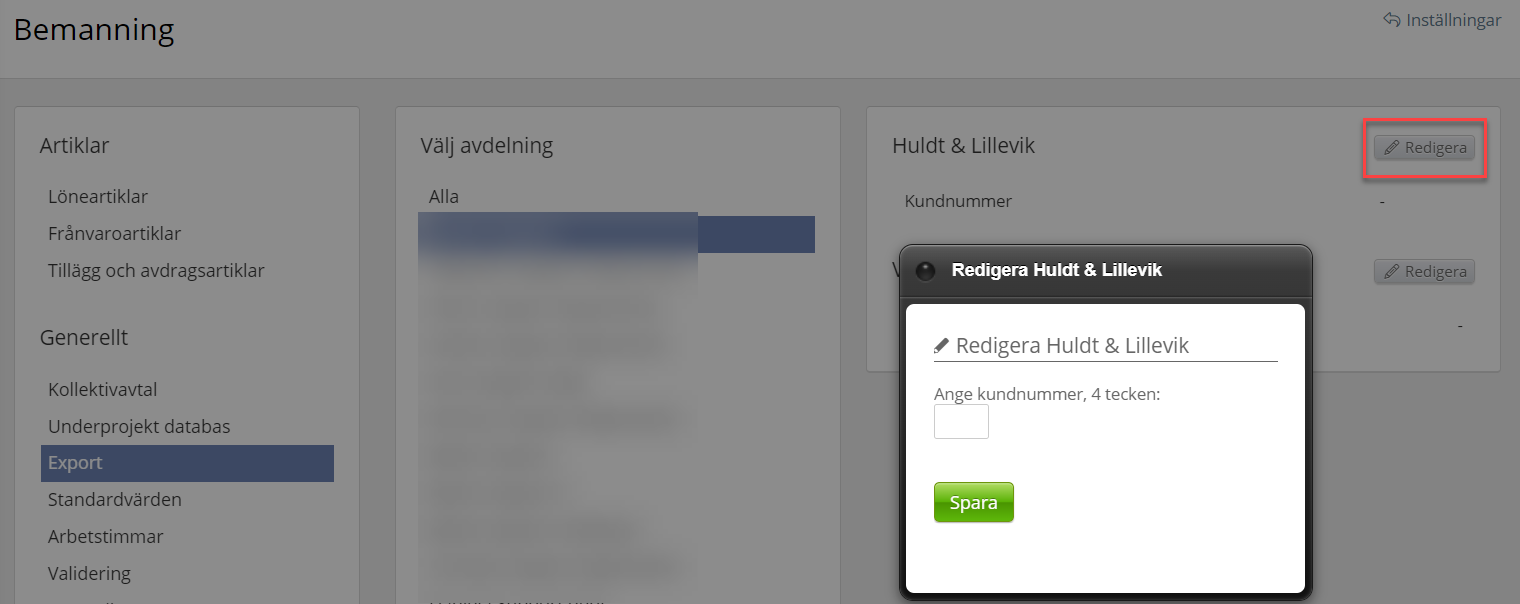 Du ställer in kundnumret för H&L på samma plats som ovan, men istället för Välja avdelning = Alla väljer du en specifik avdelning. Sedan anger du kundnumret för H&L efter att ha klickat på knappen Redigera.