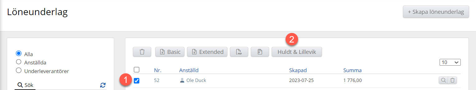 Gå sedan till översikten över de Löneunderlag som har skapats i systemet. När du nu bockar av en eller flera lönecheckar ser du att H&L kommer som ett val för export. Om du klickar på den kommer en fil med namnet huldt_og_lillevik_lonn.zip att laddas ner.