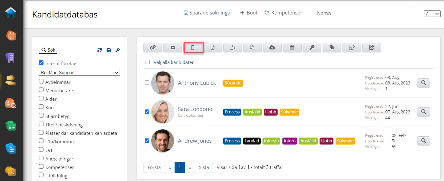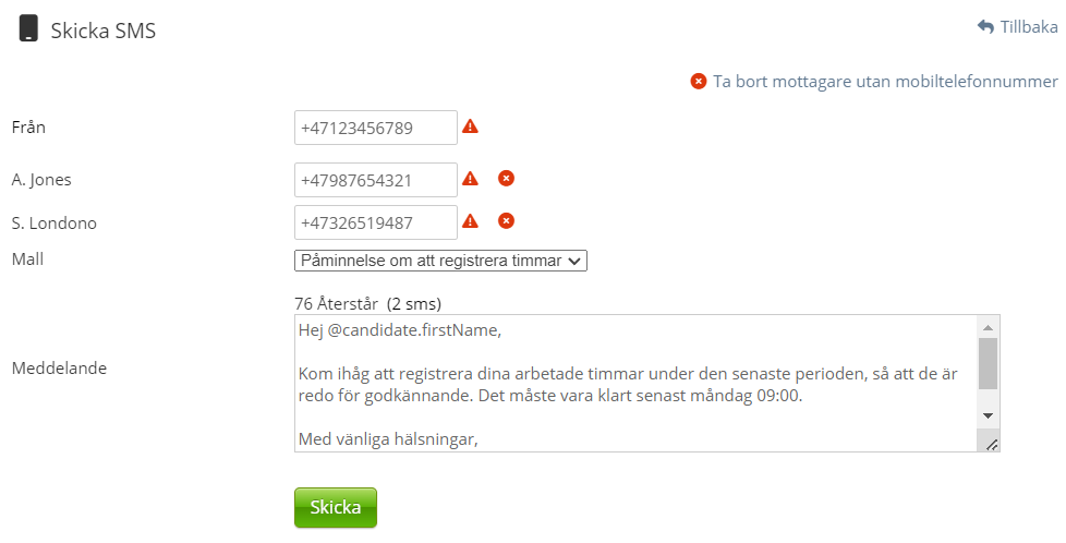 Du kan även göra mallar för de textmeddelanden som skickas från RecMan. Du skapar dem på liknande sätt som de andra typerna, förutom att dina valmöjligheter och texteditorn är något begränsade. Anledningen till detta återspeglar SMS-meddelandenas enkla karaktär. Genom att skapa SMS-mallar kan du snabbt skicka meddelanden till en eller flera kandidater, eller en företagskontakt, på det sätt som visas nedan.