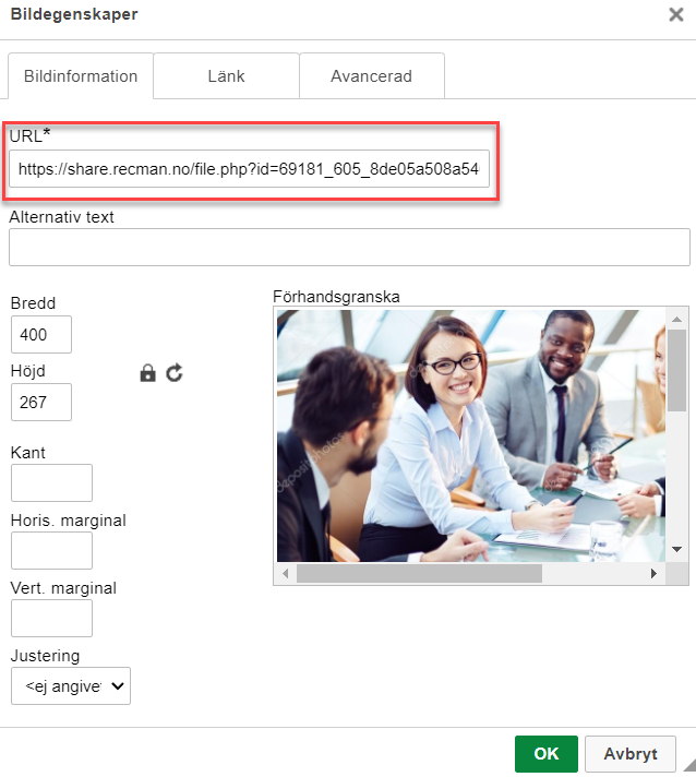 Då visas en ruta för dig. I URL-fältet klistrar du då in länken som du kopierade i dokumentarkivet. Du får då se en liten förhandsvisning av bilden och du kan också ändra storleken på bilden med hjälp av Höjd- och Bredd-värdena.