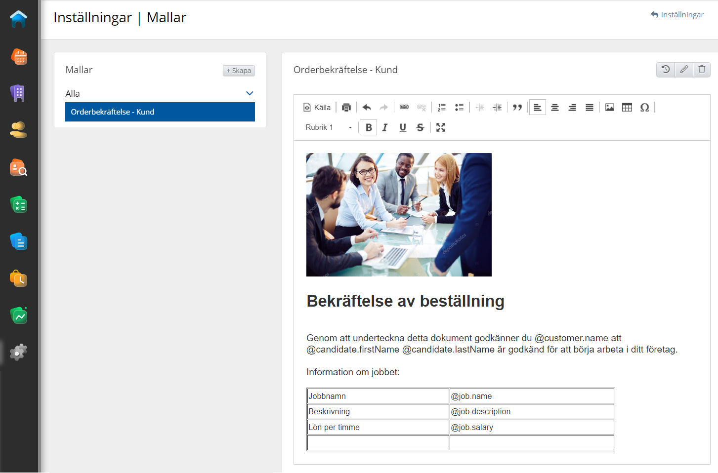 Det finns många ställen i RecMan där du kan ha nytta av mallar. Dessa inkluderar allt ifrån att tacka nej till kandidater och kandidatpresentationer till offerter/avtal och mer. Det finns tre typer av mallar i RecMan. Det första kallas helt enkelt Mallar och används vanligtvis för att till exempel skapa orderbekräftelser och avtal – dokument som behöver signeras. Sedan finns det Meddelandemallar som är utformade för e-postmeddelanden. Om du till exempel skickar ett avtal på en order till en kund, så kan du vilja ha en kort text i början som talar om hur de ska göra för att signera det elektroniskt, eller så kanske den bara innehåller en signatur. Slutligen har du SMS-mallar. Dessa har gjorts för att låta dig skicka ett snabbt textmeddelande/SMS från systemet med en fördefinierad text.