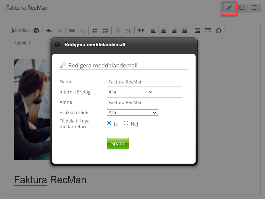 Nu när bilden finns online i systemet och vi har en länk till den så kan du gå tillbaka till mallen eller meddelandemallen som du vill infoga bilden i. När du hittat den så tryck på den lilla bildikonen.