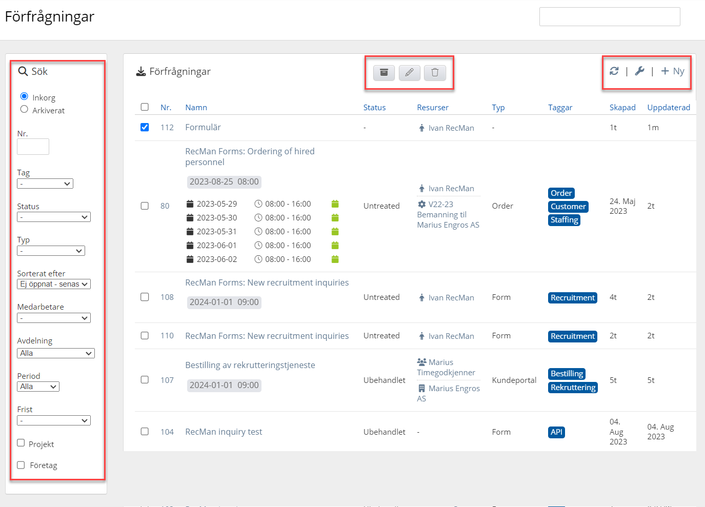 Modulen Förfrågningar är där du får in kundordrar och generella förfrågningar. En förfrågan kan läggas in i systemet per automatik, via telefon, e-post eller system-API:et. När förfrågan finns inne i systemet kan den sedan omvandlas till ett arbetspass i ett projekt, till exempel.