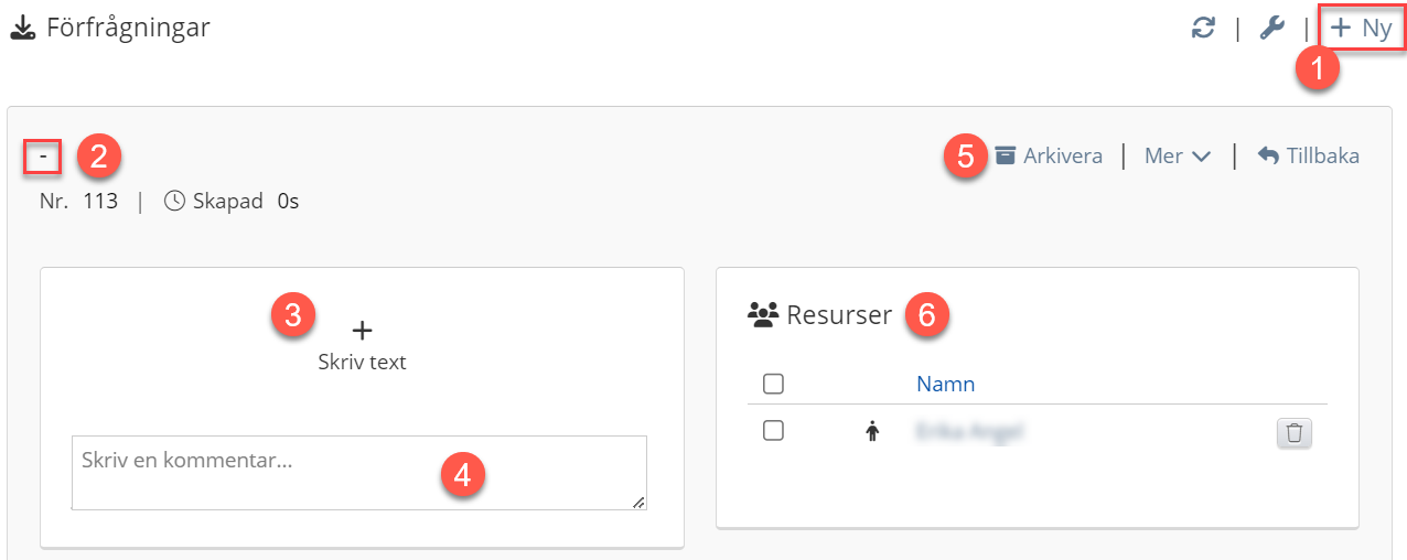 - Här kan du lägga till kommentarer för att sedan kunna följa vilka aktiviteter som utförts relaterat till förfrågan.