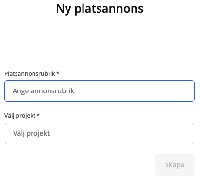 • Välj projekt: Annonsen måste kopplas till ett projekt, vilket knyter annonsen till en kund och även till en intern avdelning.
