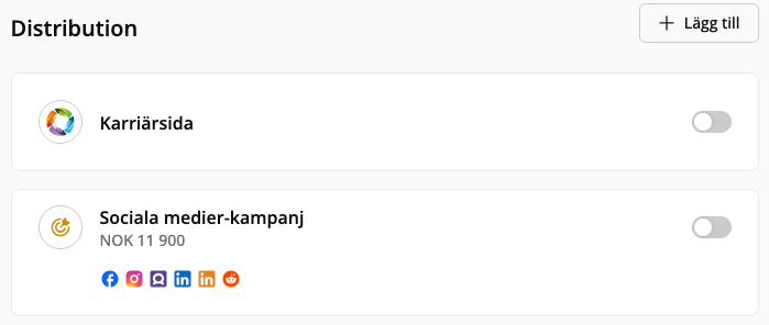 • Externa portaler: Publicera på externa annonsportaler. För att aktivera dessa, kontakta din systemadministratör så att de kan aktiveras via Marketplace eller systeminställningar.