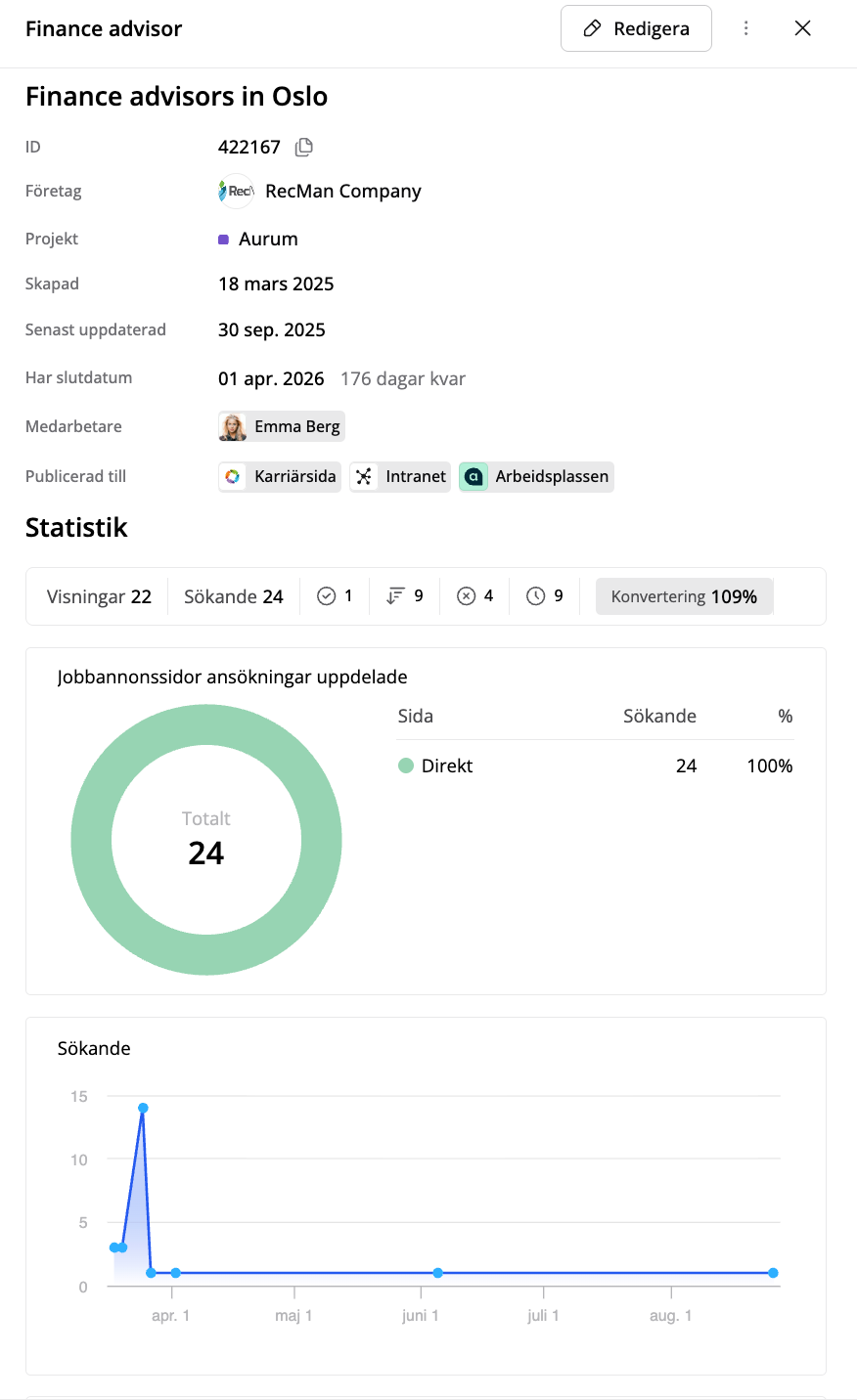 Om du klickar på jobbannonsen i översikten öppnas lådan med detaljer och statistik till höger. För att gå till ansökningarna för tjänsten klickar du bara på Sökande. Det gäller även för att se landade kandidater, kandidater i process, avvisade eller väntande (obehandlade) kandidater.