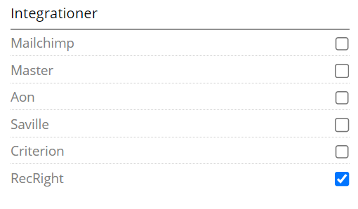 2. Gör det själv genom att gå till SysteminställningarRekryteringRecRight → Välj företag som skall skicka intervjuer → Lägg till nyckeln i fältet RecRight API-nyckel.