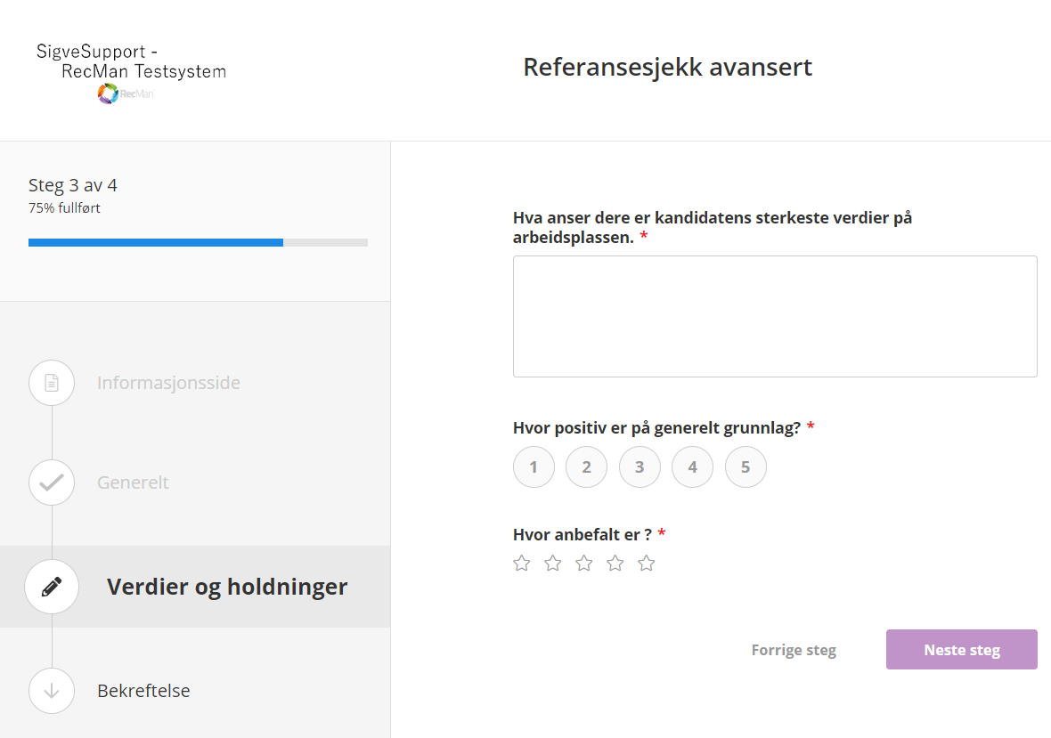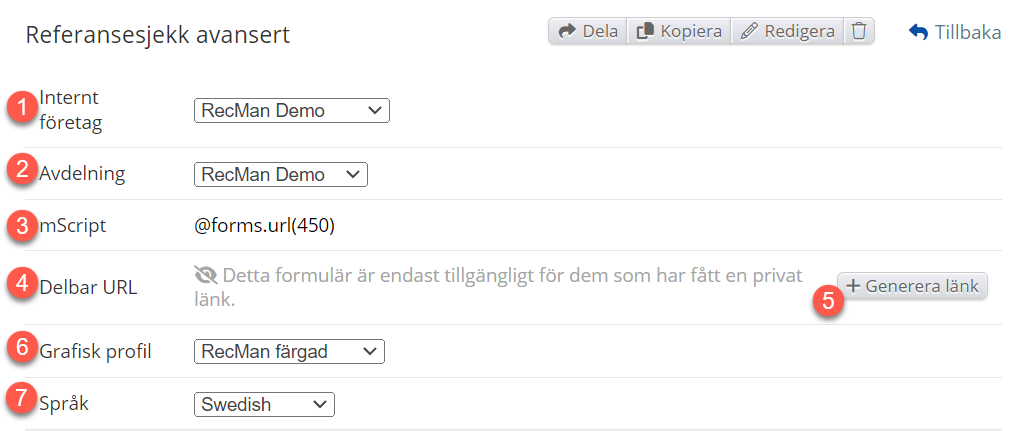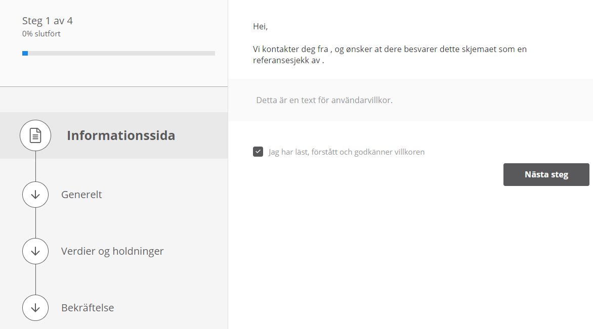 Du kan lägga till mScripts som @department.name och @candidate.firstName i introduktionen. Om detta ska användas som en digital referenskontroll kan det vara lämpligt att berätta för referensen vilken kandidat de ska utvärdera.
