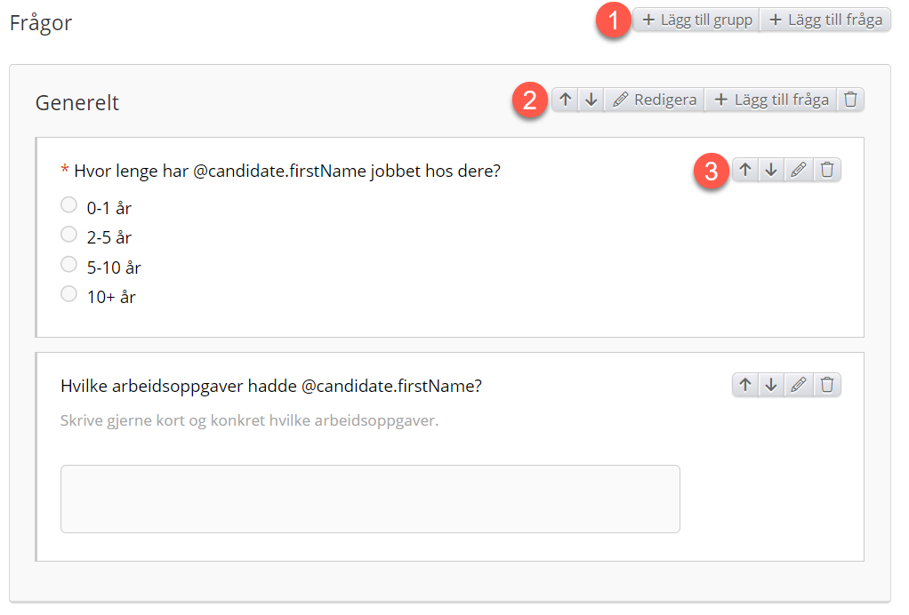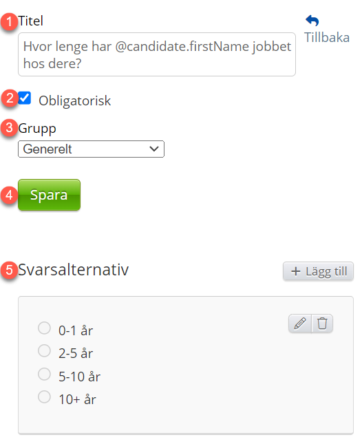 1. Titel på frågan som är synlig för svararen. Observera att du till exempel kan lägga till ”Hur skulle du betygsätta @candidate.firstName i allmänhet” i titeln.