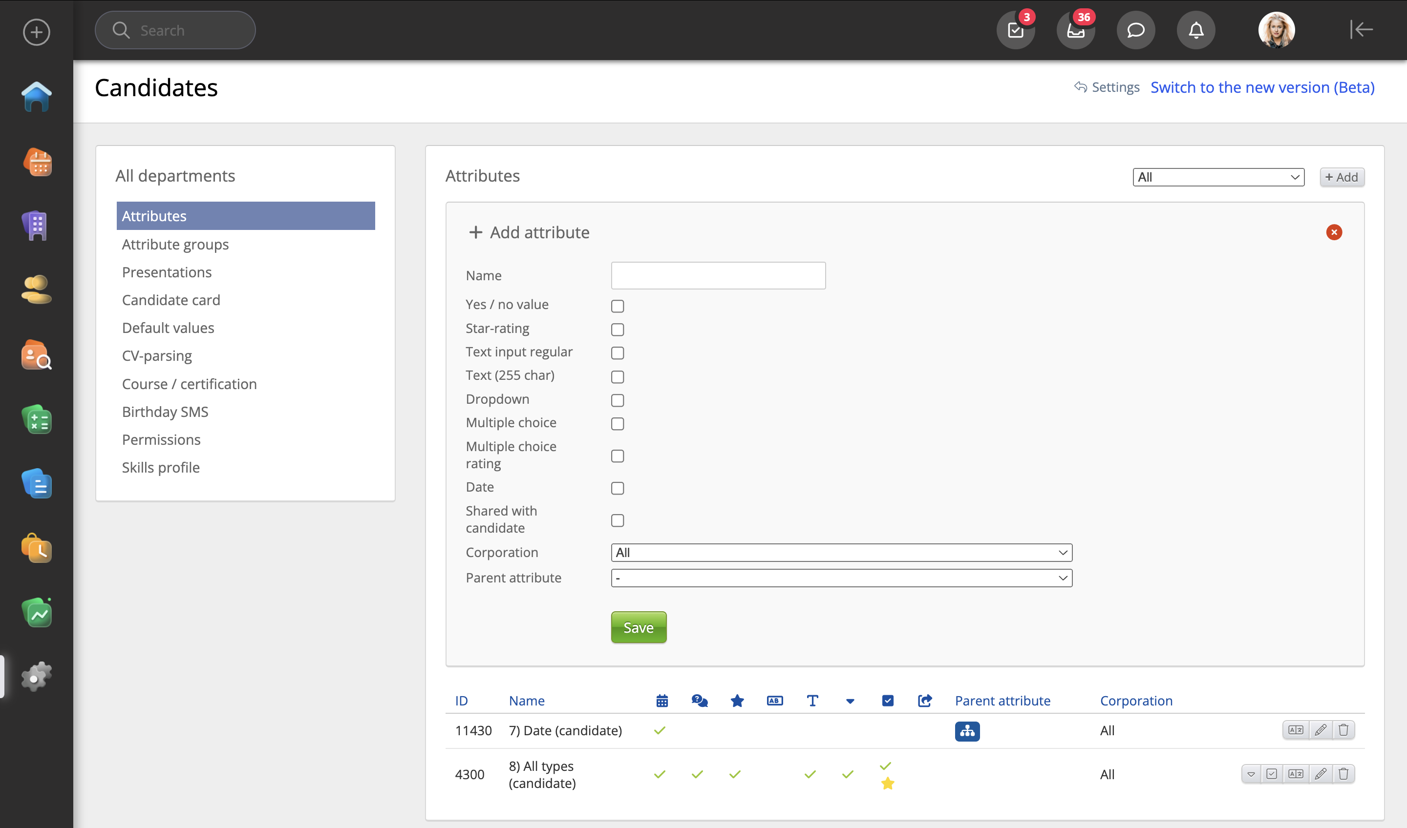 När du skapar ett nytt attribut (Systeminställningar → Kandidater → Attribut → +Lägg till) har du flera alternativ. Attributet måste alltid ha ett namn, men du har också flera alternativ för vilken typ av attribut det ska vara: