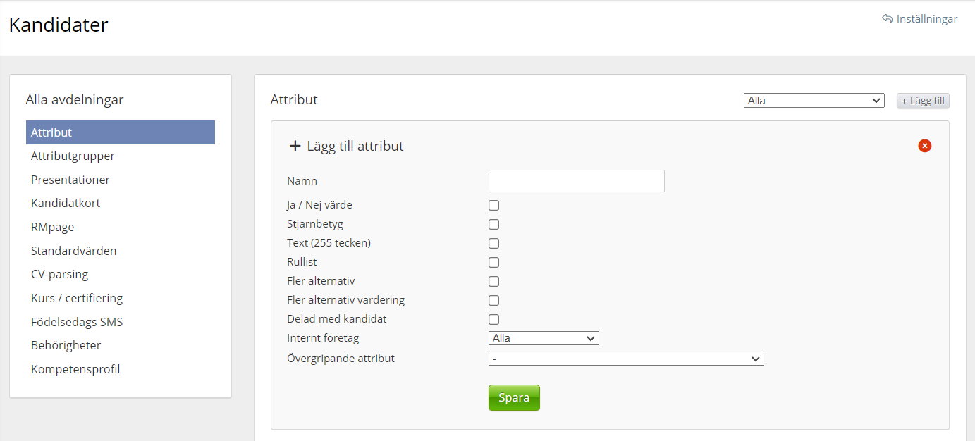 När du skapar ett nytt attribut (Systeminställningar → Kandidater → Attribut → Lägg till) har du flera val.