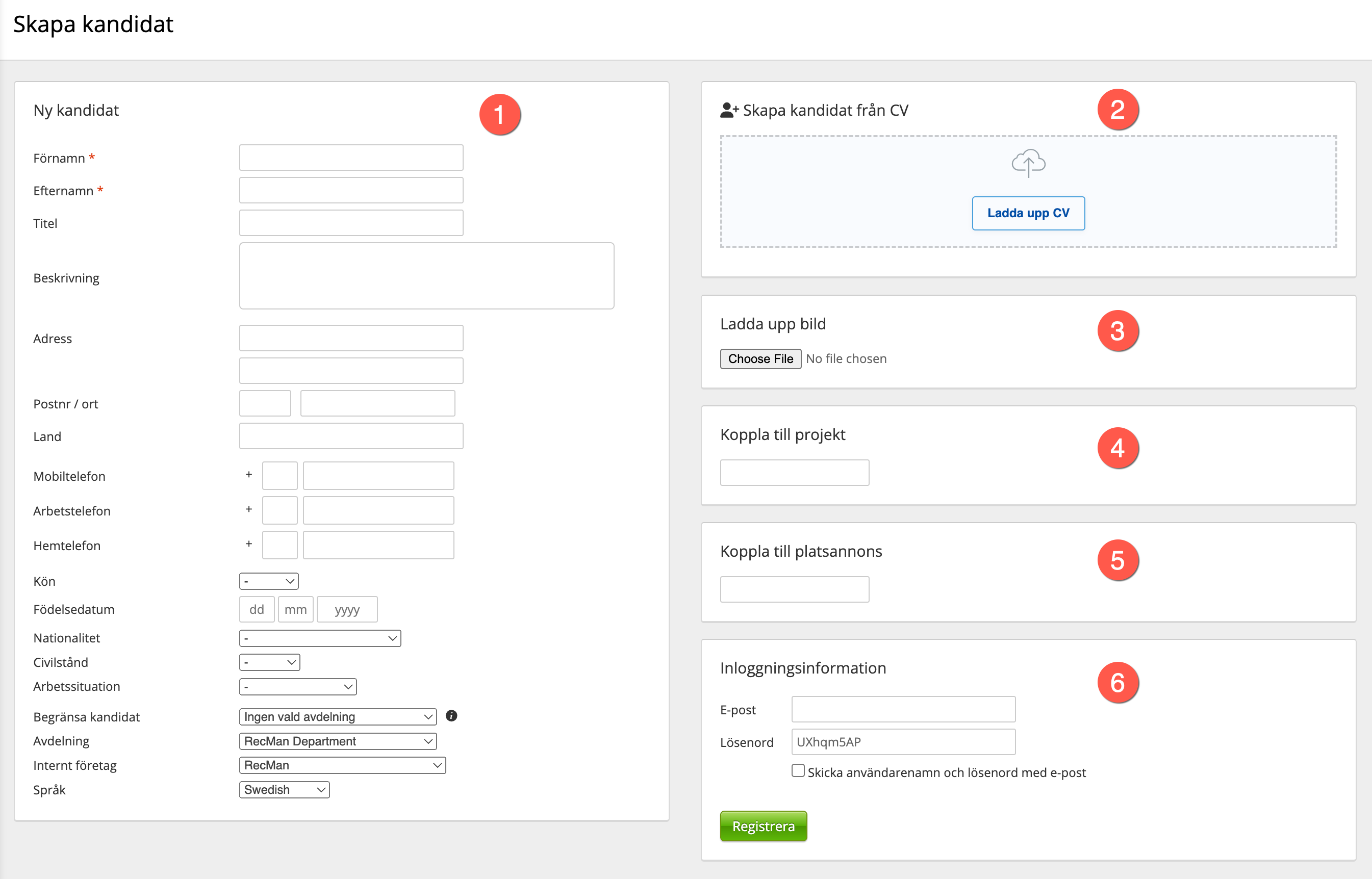 På bilden ovan kan du se en översikt över sidan Skapa kandidat. Följ de numrerade stegen för att lära dig vad de olika elementen är.