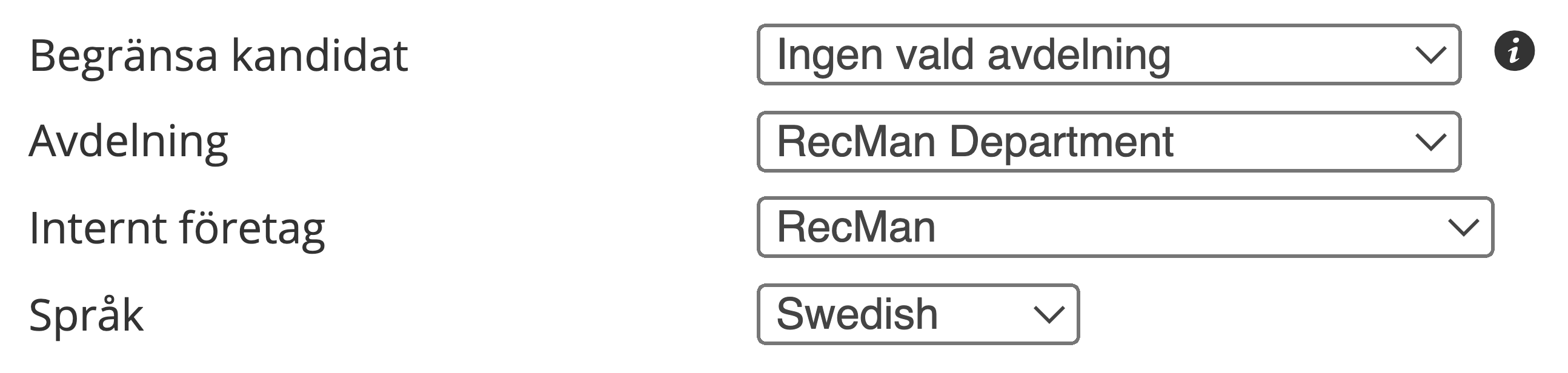 Du kan skydda en kandidat för alla andra avdelningar genom att välja en specifik avdelning. Du kan också välja en kandidattillhörighet och välja vilket språk kandidaten kommer att ha som standard när hen loggar in.
