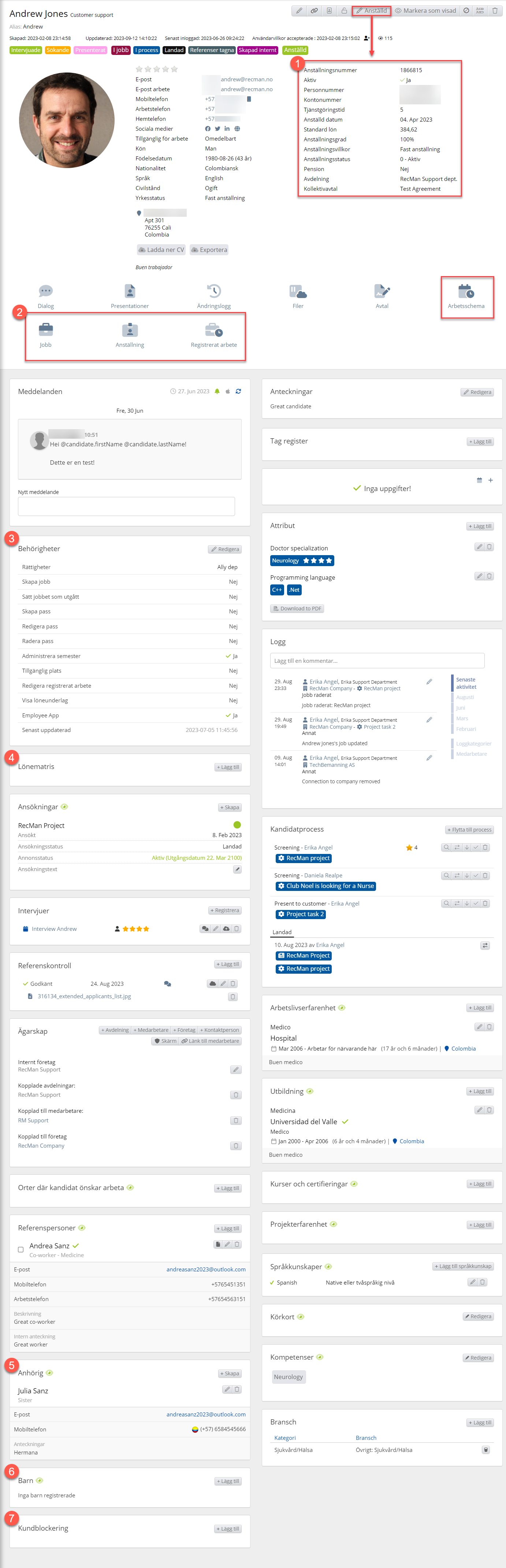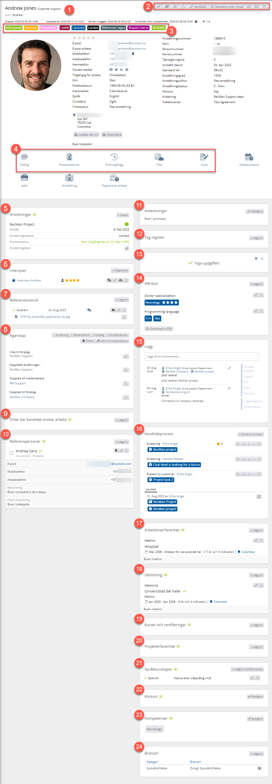 Observera att kandidatkortet kommer att se olika ut beroende på om det är en kandidat eller en kandidat godkänd för bemanning, även kallad Anställda. Anställda kommer att ha fler fält tillgängliga på sin profil. Dessutom kan fler fält aktiveras i kandidatinställningarna. Nedan kan du se hur kandidatkortet kan se ut med förklaringar till respektive fält, samt anställdvarianten.