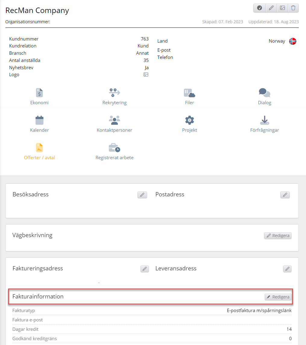 Gå in på kundens kundkort, ner till sektionen för fakturainformation.