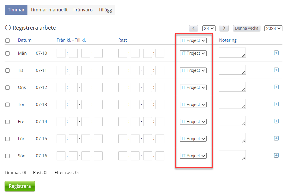 När den anställda registrerar arbete, eller du registrerar arbete för den anställdes räkning, så kommer det nu att finnas möjlighet att välja vilket underprojekt som man vill registrera arbetet på.