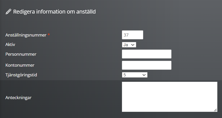 Personalnumret kan ändras direkt i RecMan på kandidatkortet. Om du skapar två nya medarbetare samtidigt och inte sparar en först – kan du uppleva att du får två medarbetare med samma nummer och måste ange och redigera detta på kandidatkortet.