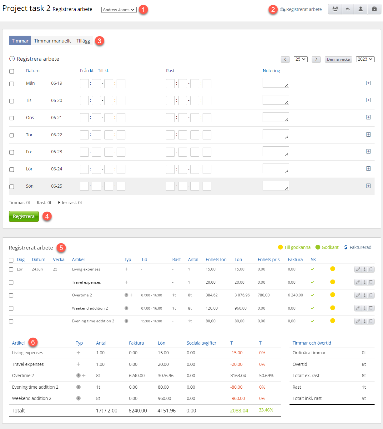 - Summering: Här får du en sammanställning av det registrerade arbetet, uppdelat på ordinarie timmar, övertid, frånvaro mm samt lön och fakturapris.