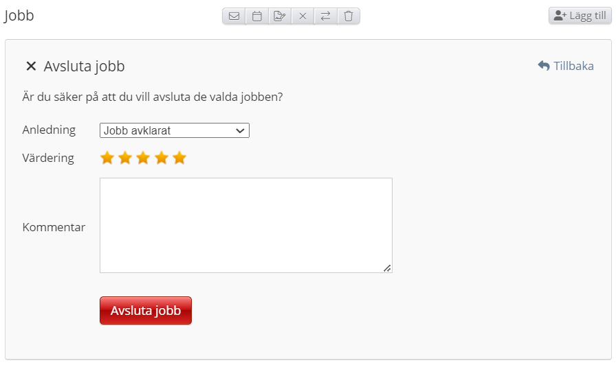 Som du kan se har du möjlighet att ge en anledning till varför jobbet ska avslutas, sätta ett betyg på jobbet och lägga till en kommentar. Under anledning har du följande alternativ: